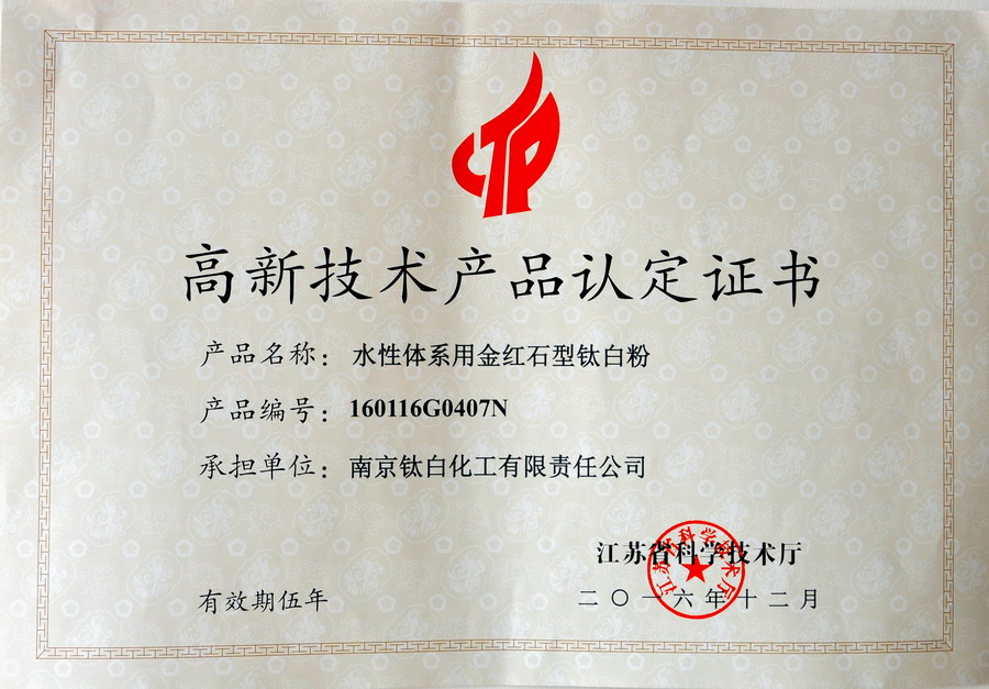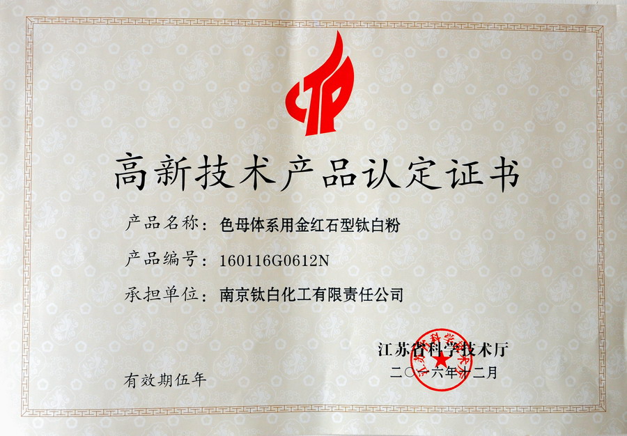 近日,南京钛白公司从江苏省科技厅下发的《关于公布2016年江苏省第三批高新技术产品名录的通知》,以及《关于公布2016年江苏省第四批高新技术产品名录的通知》获悉,南京钛白公司“水性体系用金红石型钛白粉”(产品编号:160116G0407N)和“色母体系用金红石型钛白粉” (产品编号:160116G0612N)两项产品,被认定为江苏省高新技术产品,有效期伍年。