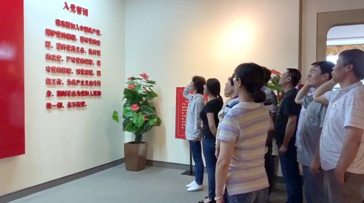 在悬挂着巨幅党旗的宣誓墙前,全体党员干部举起右手,庄严宣誓,重温入党誓言,牢记使命担当;并在誓言墙上留下了誓言。