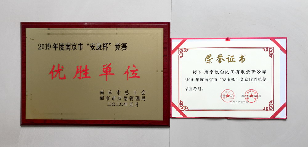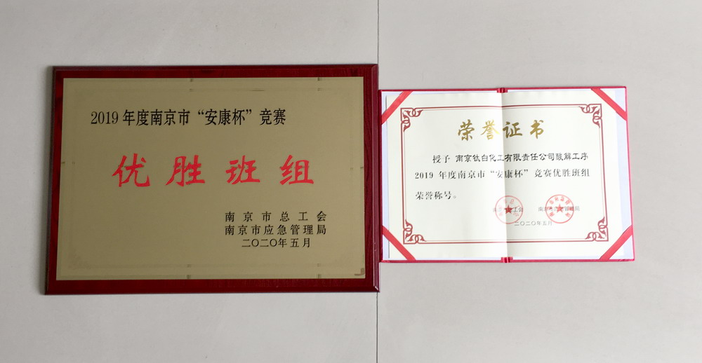 近日,从南京市总工会传来喜报,南京钛白公司荣获2019年度南京市“安康杯”竞赛优胜单位称号;一车间酸解工序同时荣获“安康杯”竞赛优胜班组称号。