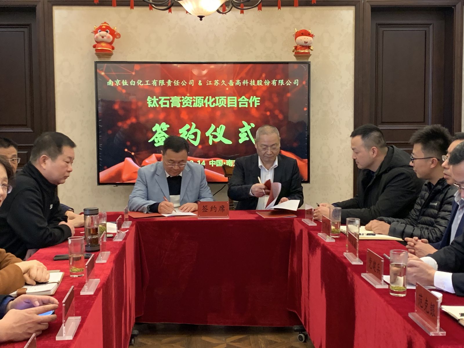 南京钛白总经理殷红忠、久吾高科总经理范克银分别在项目合作协议书上签字。该项目的启动,对南京钛白钛石膏资源化利用并实现高质量发展具有里程碑式的重大意义。
