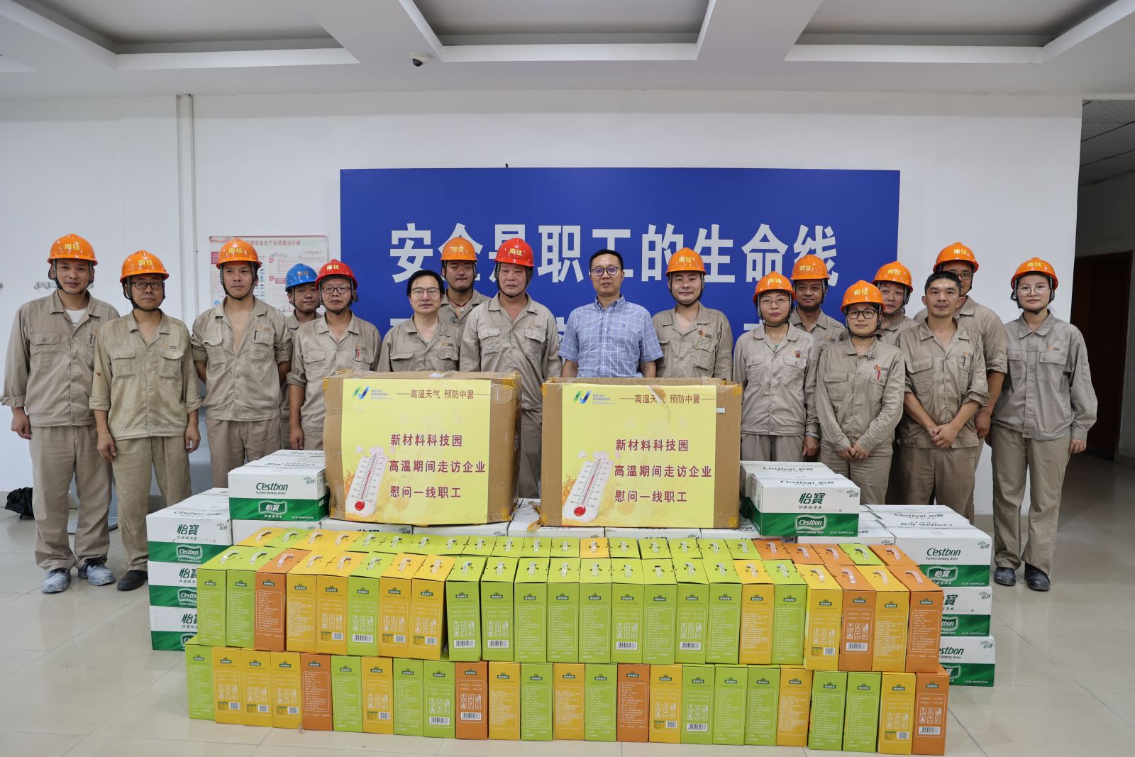 20日14:00时,新材料科技园管理办公室副主任王强一行,冒雨前来南京钛白公司,慰问高温酷暑下奋战在生产一线的员工,王主任向大家表达了深深的敬意,并为公司员工们带来了毛巾、风油精、矿泉水、果汁饮料等防暑降温用品。