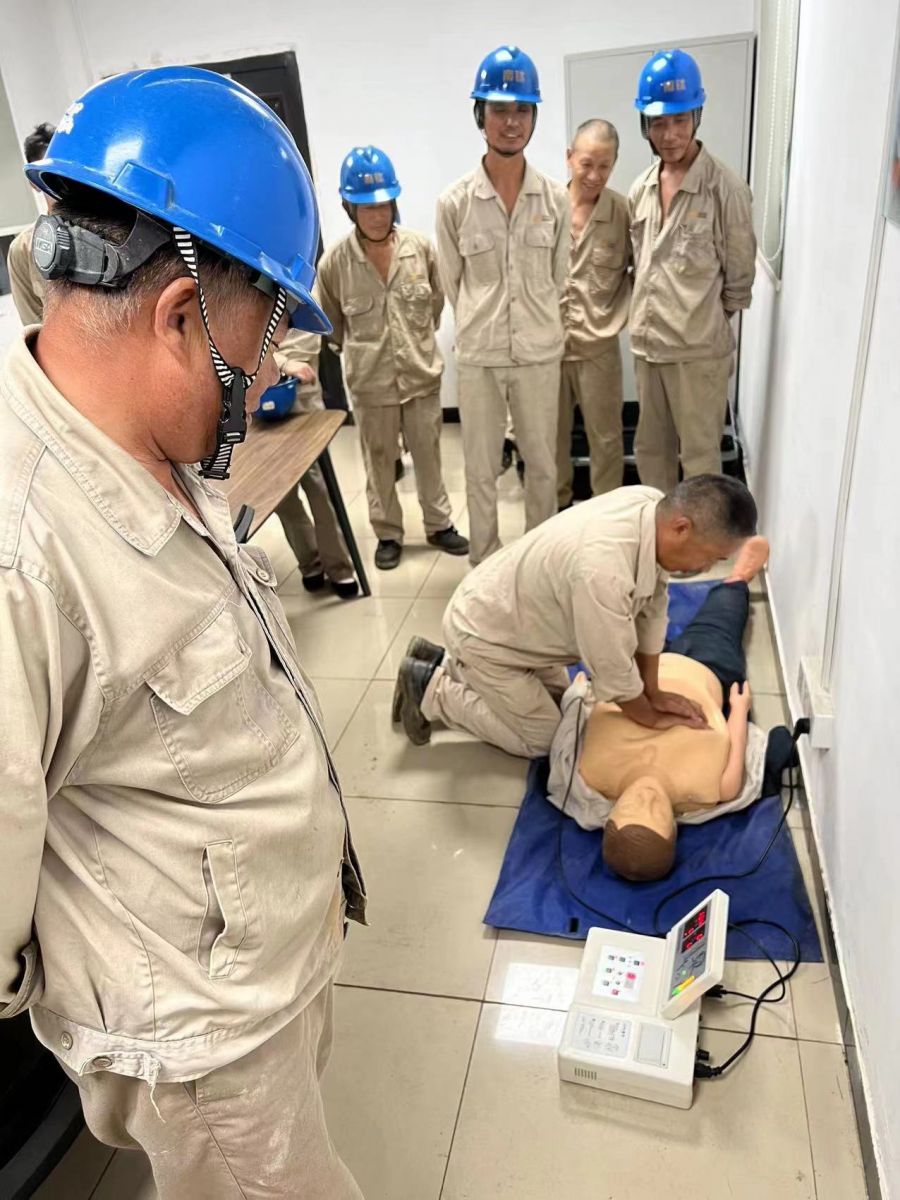 车间安全员薛金龙担任讲师,安全环保部提供仿真假人等道具支持。培训由文字图片讲解、实操演示以及人员实操演练三个部分组成。讲师首先为参训人员细致讲解了心肺复苏和人工呼吸注意事项,并现场演示如何对假人进行心脏复苏按压抢救,包括胸外心脏按压、清理口腔异物、开放气道、人工呼吸等。演示结束后,参训人员逐个进行实际操作练习,并由安全员一对一指导。