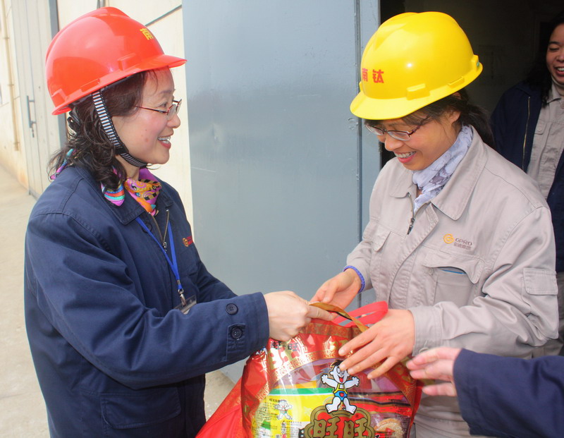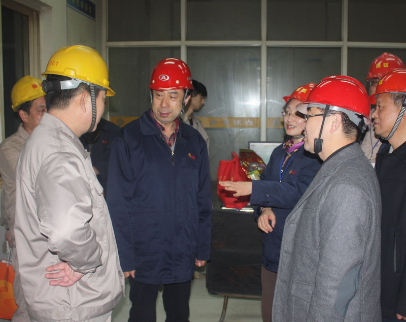 2014年正月初一, 南京钛白公司总经理彭安铮女士陪同金浦集团领导看望慰问在节日中坚守工作岗位的一线员工。