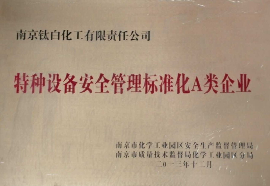 2013年12月,经南京市化学工业园区质监局专家组评审,授予南京钛白公司“特种设备安全管理标准化A类企业”荣誉称号。2014年7月,钛白公司获得授牌。