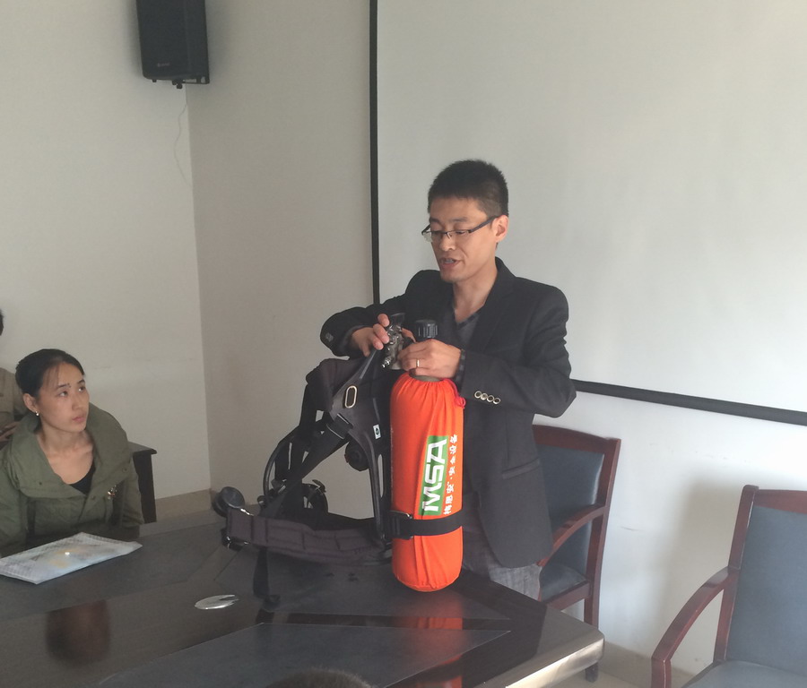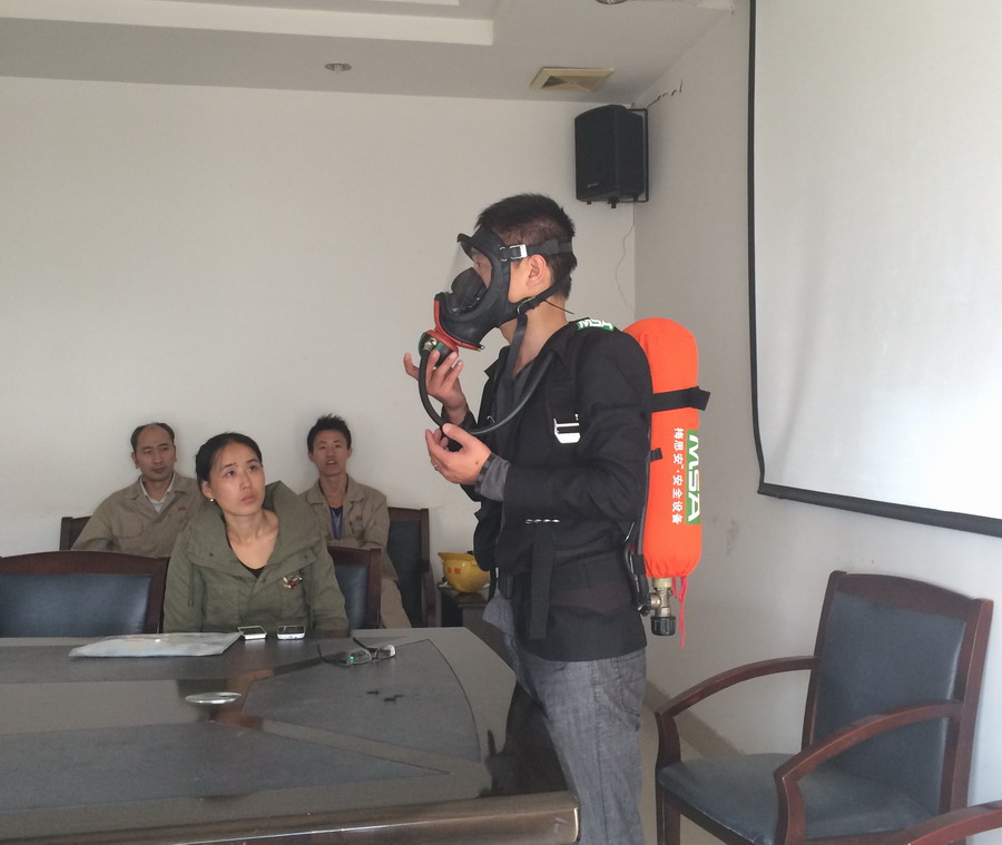 此次培训,由梅思安厂家的孙网培训师进行授课,他首先从空气呼吸器的基本结构、性能、工作原理、使用参数等方面进行了详细讲解,并着重对呼吸装置的使用前准备、使用时注意事项及正确佩戴方法作了全面系统讲解,同时进行了现场示范操作;随后,参训人员在孙网培训师的指导下,开展了实际操作练习,整个培训过程生动、实用、有效。