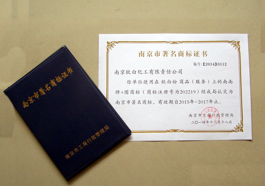 经南京市工商行政管理局认定,南京钛白公司“南南牌”商标再次荣获南京市著名商标,这不仅是对公司始终如一“坚持品牌、诚信经营”理念的肯定,更是继2012年荣获该称号之后的又一次品牌飞跃。
