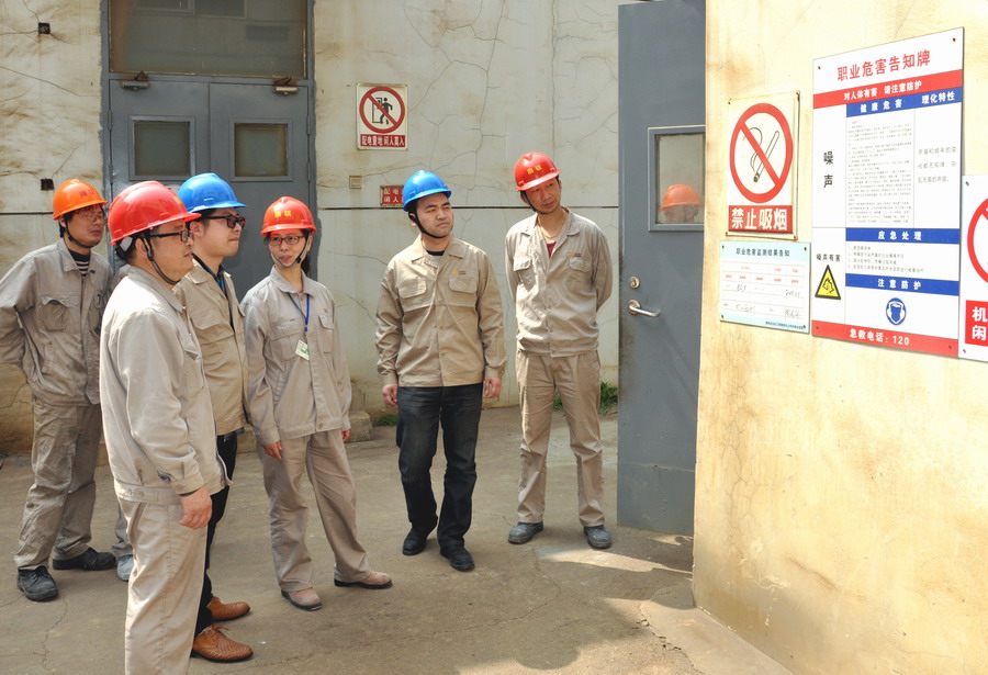 检查组在公司安环部及工会有关人员的陪同下,前往车间生产岗位现场,实地对一车间过滤、水解、酸解,以及四车间空压站等重要工作场所职业危害防护设施的运行、个人防护用品的配备及使用是否正常、职业危害因素告知标识及职业危害防护措施是否落实进行了重点检查。
