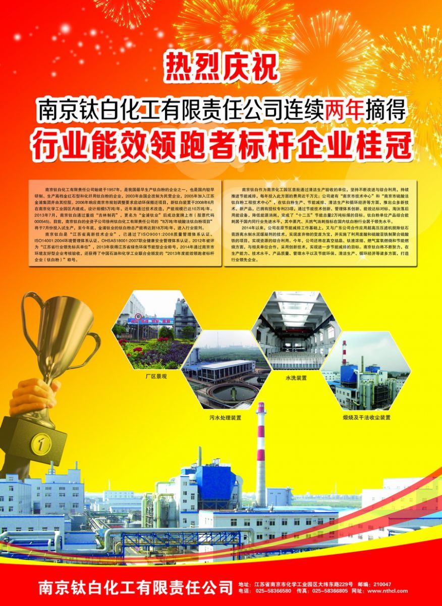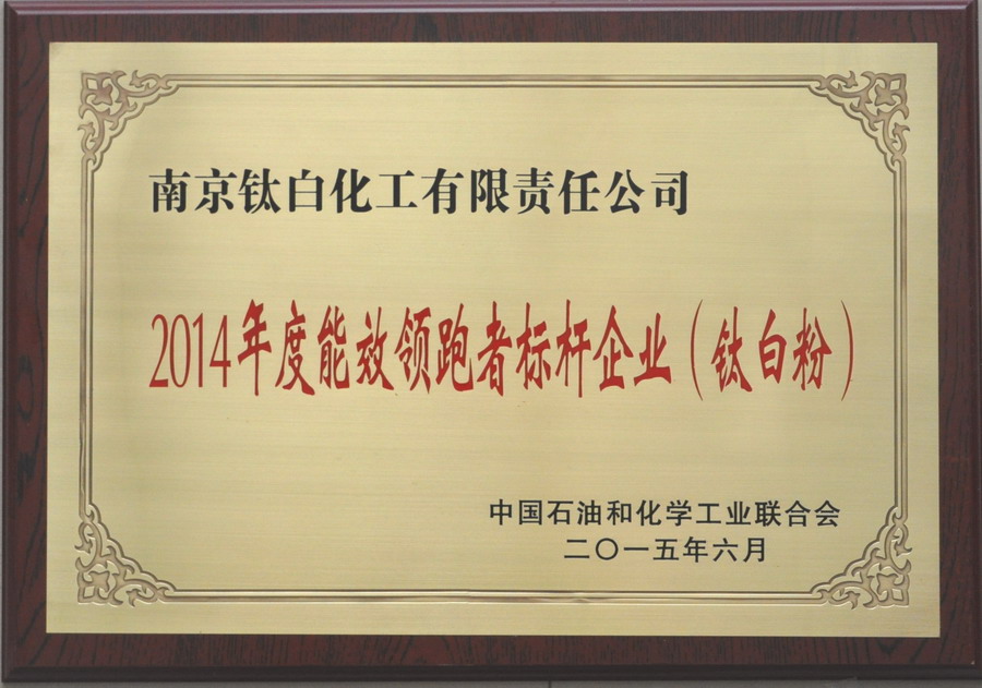 6月25日,中国石油和化学工业联合会组织召开了2014年度石油和化工行业重点耗能产品能效“领跑者”发布暨节能技术交流与推广会,对原油加工、乙烯、合成氨、甲醇、电石、烧碱、聚氯乙烯、纯碱、黄磷、磷酸一铵、磷酸二铵、硫酸、钛白粉、氧化铁系颜料、醋酸等15个产品的能效“领跑者”标杆企业名单和指标予以发布。南京钛白公司锐钛型钛白粉产品喜获殊荣。这是我公司连续两年摘得“行业能效领跑者标杆企业”桂冠。为此,中国化工报社于6月26日专刊予以了报道。