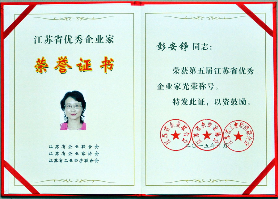 为弘扬优秀企业家艰苦创业、勇于创新的时代精神,肯定企业家群体在推动社会科学发展、加快经济转型升级中的重要地位,促进全省企业家队伍持续健康成长,由各市企联、省直各有关行业协会推荐,经省多个综合部门组成的评审委员会按程序复核、审议,第五届“江苏省优秀企业家”评选揭晓,南京钛白公司总经理彭安铮女士获此殊荣。