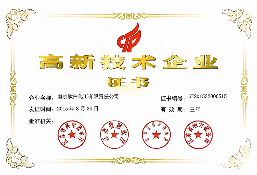 2012年,南京钛白公司通过了高新技术企业认定,有效期为三年。2015年年初,钛白公司根据《高新技术企业认定管理办法》和《高新技术企业认定管理工作指引》等相关要求,及时开展认定复审工作。经过企业申报、初审、专家审查及公示等程序,日前钛白公司顺利通过了高新技术企业认定复审。